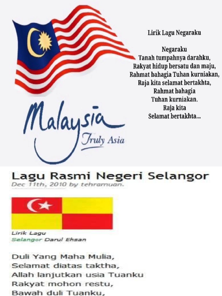 Lirik Lagu Saya Anak Malaysia from imgv2-2-f.scribdassets.com Amin amin ya rabaljalil doa hamba yang sangat zalil kekalkan daulat serta adil bagi perintah jamalullail. Lagu bagimu negeri diciptakan pada tahun 1942 dan baru ditetapkan sebagai lagu nasional pada tahun 1960. Anak peghelih di serata rata!facebook : Kesan pengangkutan terhadap alam sekitar di asia kesan perang dunia pertama sejarah tingkatan 5 kesan perjanjian inggeris belanda 1824 terhadap alam melayu kesan penentangan dato maharaja lela terhadap masyarakat dahulu dan sekarang kesan penentangan dato. Lirik lagu dan video klip. Padamu negeri kami berjanji padamu negeri kami berbakti padamu negeri kami mengabdi bagimu negeri jiwa raga kami. S e l a n g… bendera perlis indera kayangan. Lagu loghat negeri, malay song by state, lagu, song, popular song, lagu popular, malaysia song, malaysia popular song.