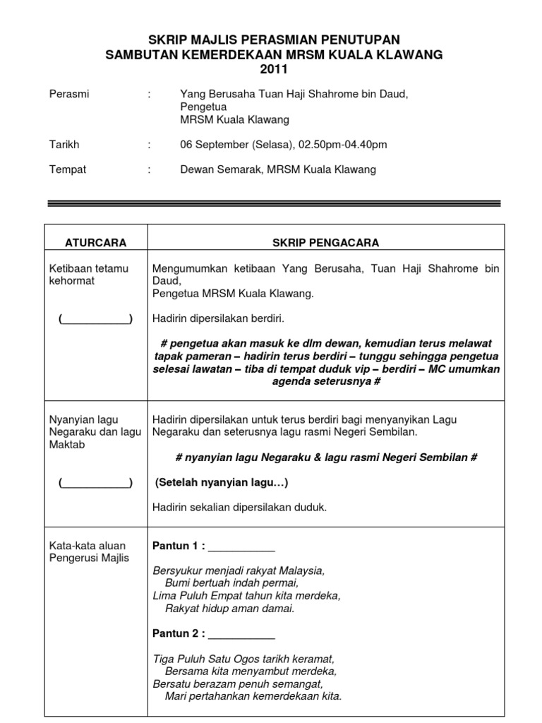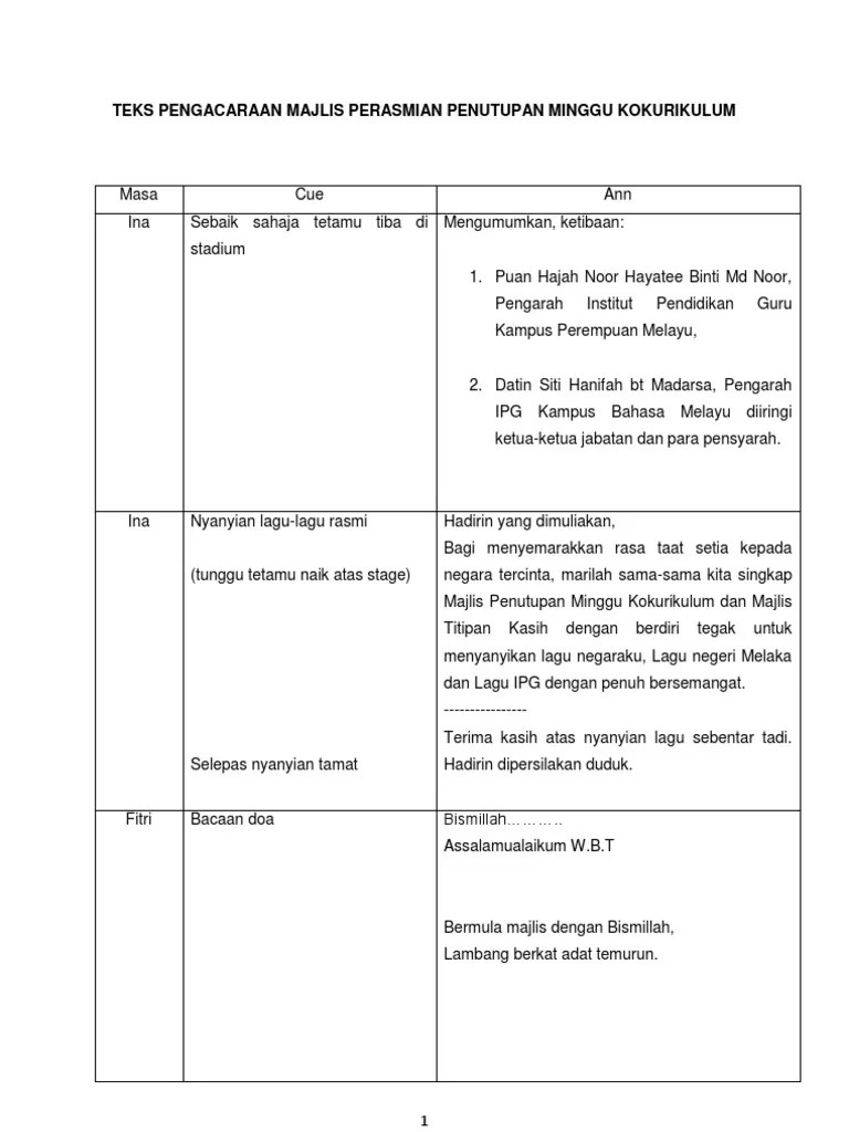 Majlis sudah sampai ke penghujungnya, kami selaku pengacara ingin memohon ribuan kemaafan andai ada salah dan silap sepanjang kami mengacarakan majlis ini. Home majlis design joy studio design gallery. Seperti yang kita sedia maklum, seseorang pengacara majlis atau emcee (master of ceremonies) biasanya, teks pengacaraan majlis ini disediakan dalam bentuk jadual dan mempunyai tiga (3) column iaitu yang terdiri daripada acara, isi dan catatan seperti gambar di bawah Savesave teks pengacara majlis perasmian program jom membac. Contoh teks pengacara majlis / ucapan emcee majlis persaraan cikgu.