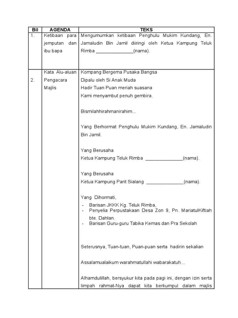 Majlis sudah sampai ke penghujungnya, kami selaku pengacara ingin memohon ribuan kemaafan andai ada salah dan silap sepanjang kami mengacarakan majlis ini. Seperti yang kita sedia maklum, seseorang pengacara majlis atau emcee (master of ceremonies) biasanya, teks pengacaraan majlis ini disediakan dalam bentuk jadual dan mempunyai tiga (3) column iaitu yang terdiri daripada acara, isi dan catatan seperti gambar di bawah Teks pengerusi majlis masa perkara 8.00 pm. Sirih junjung berhias indah, sekacip pinang pembuka kata, bunga manggar kilau bercahaya, datang berkuunnjg ke majlis meriah, sejarah terukir nilai permata Please fill this form, we will try to respond as soon as possible.