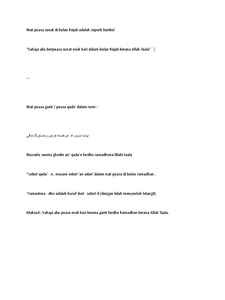 Nawaitu shouma ghodin 'an qadaa'in fardho romadhoona lillahi ta'alaa . Pengertian dari puasa ganti atau qadha adalah puasa yang di laksanakan sebagai pengganti dari puasa yang di tinggalkan pada bulan ramadhan yang membedakan antara puasa ganti dan puasa lainnya hanya terdapat pada kalimat niatnya saja seperti dengan niat puasa senin kamis atau puasa. Lafadz niat qadha puasa ramadhan. (update informasi lain seputar puasa sunnah di sini). Panduan lengkap niat puasa ganti ramadan (qadha puasa) termasuk cara pengiraan bayar fidyah yang betul, dalam rumi.